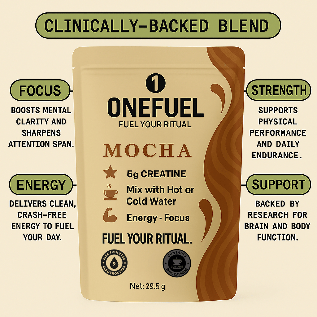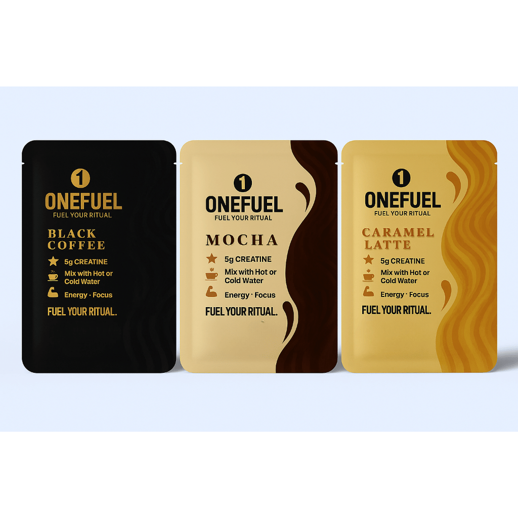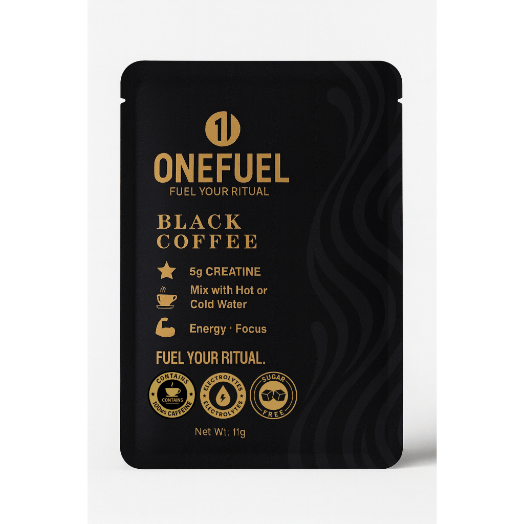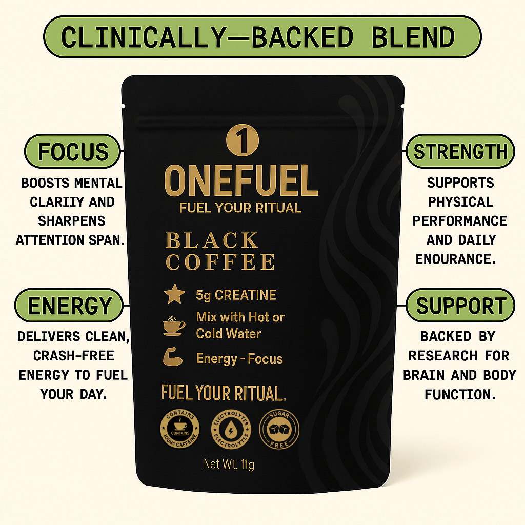 OneFuel Coffee combines three proven ingredients — premium Colombian coffee, 5g of creatine monohydrate, and electrolytes — into one convenient daily ritual. No weird fillers, no synthetic junk. Just clean focus, strength, and hydration in a scoop or sachet.